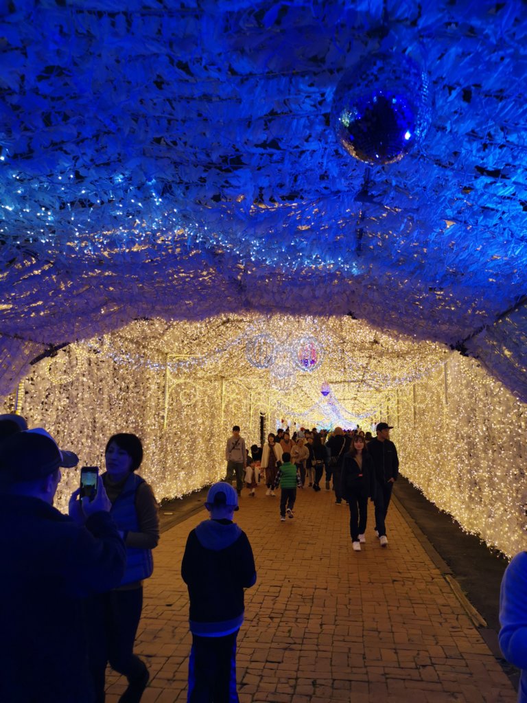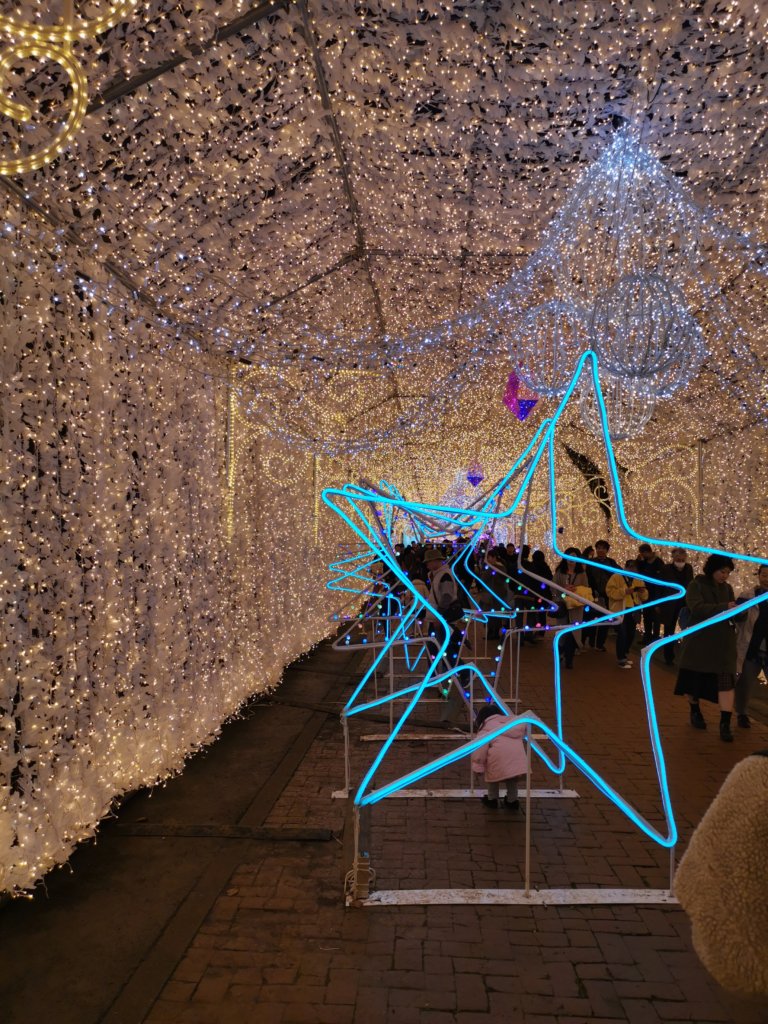 中間ぐらいに何個か星形のイルミネーションがあります。子供達がくぐって遊んでいました