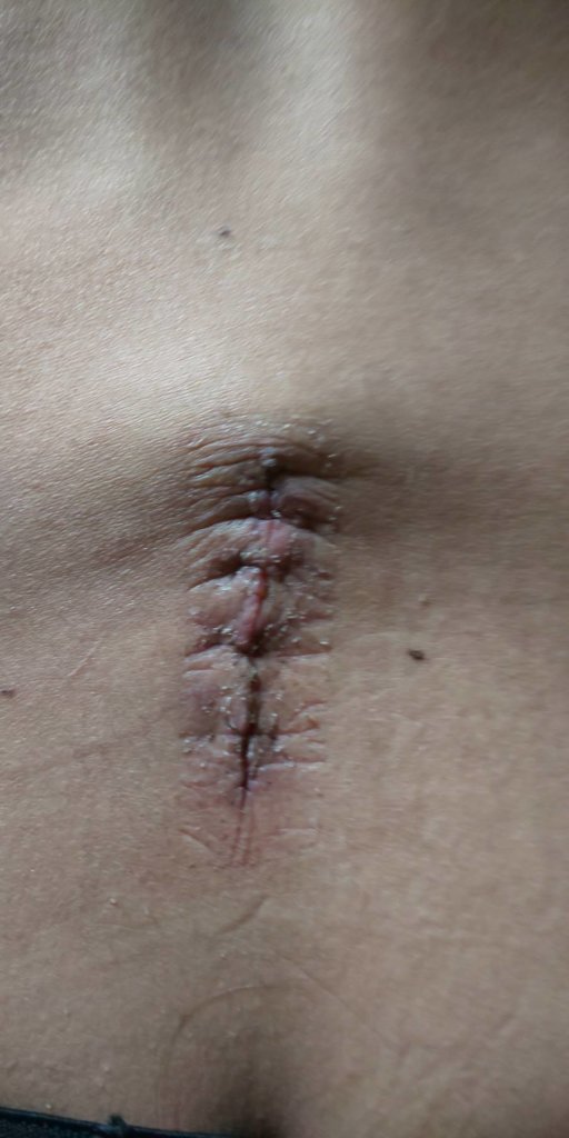 10センチぐらいの傷跡。しばらく、皮膚がつっぱった感じになるのと…尾骨みたいに真ん中あたりが盛り上がります…。