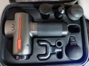 内容は、マッサージガン本体・アタッチメント5個、充電アダプター